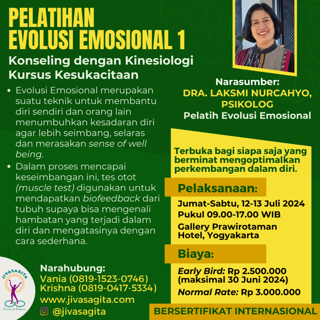 Diri setiap manusia itu berbeda, spesial, dan istimewa. Kelas Evolusi Emosional adalah undangan untuk menemukan diri dan sukacita yang sejati. Bagi Anda yang tertarik untuk mengoptimalkan perkembangan pribadi, mari belajar bersama untuk mengatasi hambatan dalam diri dalam proses perkembangan. 🌱
